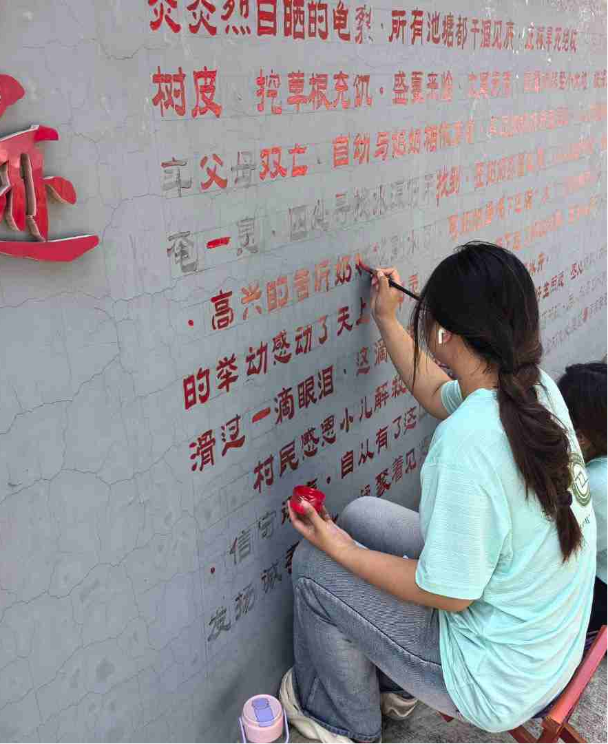 洼子村村委会主体墙面的村史介绍文字历长期风雨侵蚀,已出现颜料剥落、字迹漫漶的现象,影响乡村历史文化的有效传播。实践团成员抵达后,迅速对损毁情况展开系统勘查,并对需要修复的区域进行了标注。整个过程中,实践团成员始终贯彻历史风貌保护理念,力求让修缮成果能够清晰传递信息,保障其可读性。