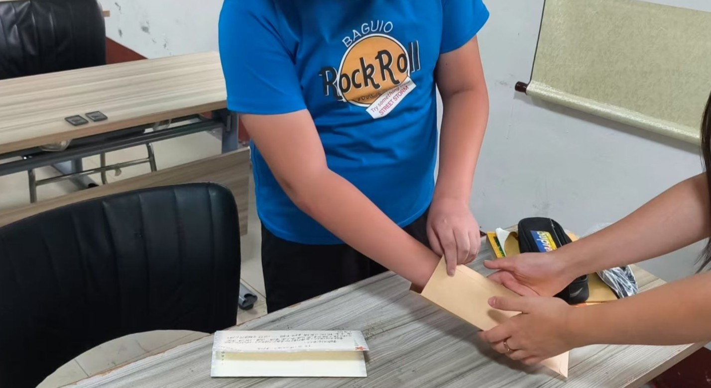 图为老师跟同学一起装书信的场景 山东理工大学魏宇鑫提供