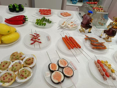 展厅内一组以淄博烧烤为主题的琉璃作品吸引了实践团的注意。作品生动还原了烧烤场景,颇具生活气息,将地方特色文化与传统琉璃技艺相结合,展现出非遗贴近生活的一面。成员们围绕这类创新作品展开交流,探讨传统工艺如何更好地融入现代生活、贴近大众需求。