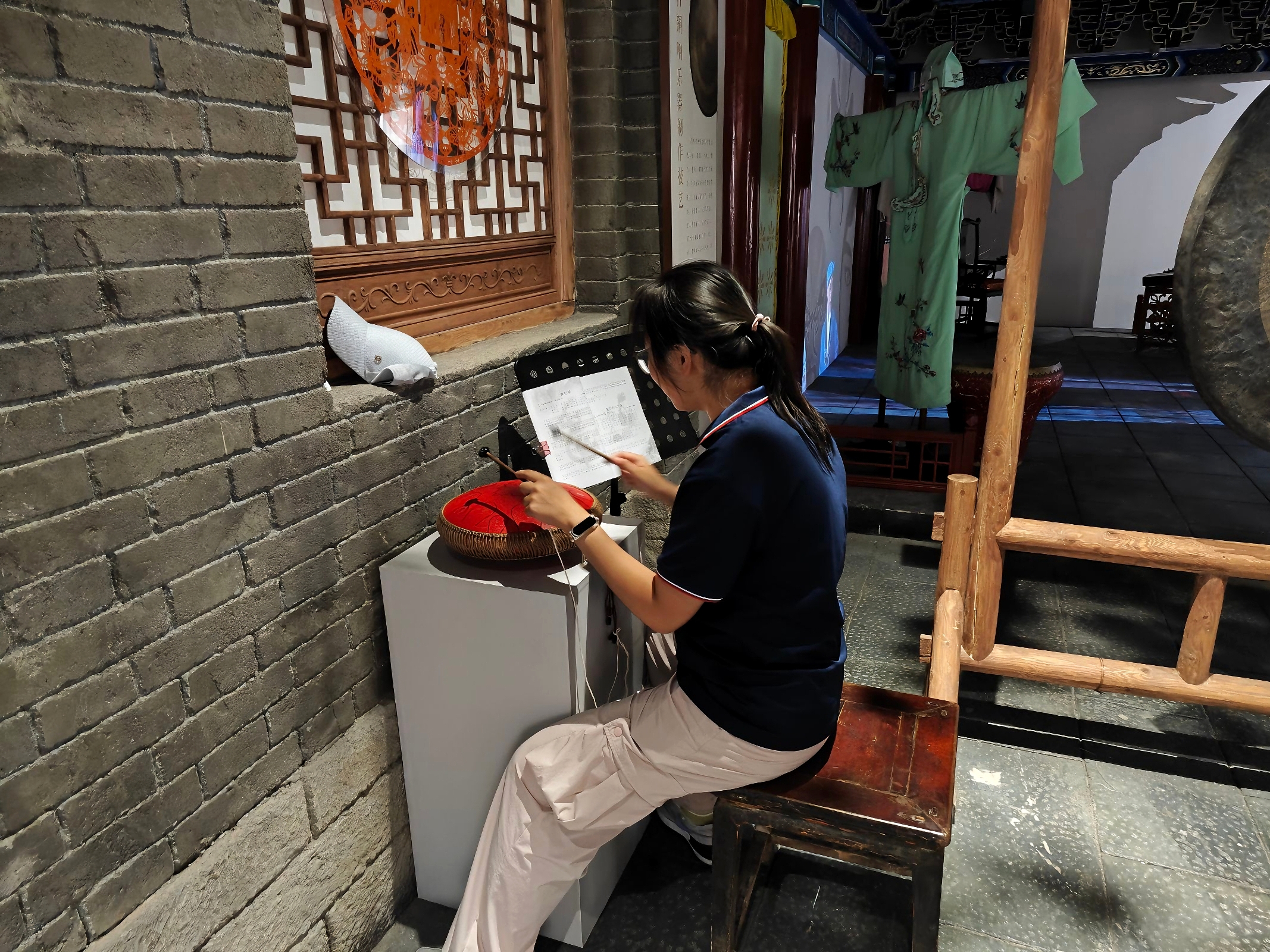 淄博市文化馆的展陈体系以音乐与书法为核心脉络,完整呈现了当地艺术文化的发展轨迹。“齐风乐韵” 展区作为音乐文化的核心板块,系统展示了淄博传统音乐的丰富谱系。其中,五音戏专题展通过戏服、道具、曲谱手稿及经典剧目影像资料,清晰呈现了这一地方戏曲剧种 “唱腔婉转、表演细腻” 的艺术特色,传承人现场录制的教学视频,更是让实践团成员直观感受到其 “一生一旦、一丑一旦” 的表演范式。