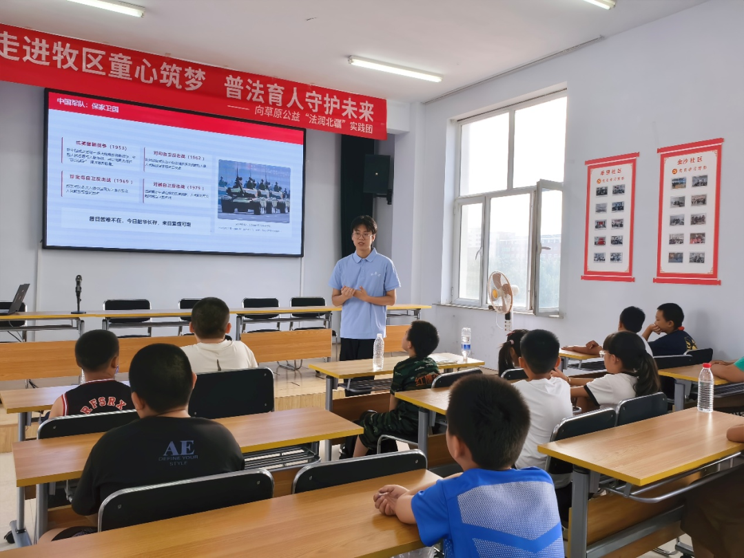 8月11日,法学院“法润北疆”实践团深入内蒙古自治区奈曼旗大沁他拉镇希望社区支教点,开展以“国防科技教育”为主题的支教活动。实践团通过多种形式传递国防知识与爱国力量:开设国防与军队知识入门课,结合图片、视频和故事,讲述人民军队发展历程、我国国防现状及不同军种职能,展现军人的奉献精神;播放新中国成立七十周年阅兵式片段,让孩子们感受国防现代化成果;放映抗战纪录片,引导孩子们铭记历史、珍惜和平;教唱《强军战歌》,传递强军梦想与爱国情怀。这些活动让孩子们在互动中收获知识,厚植爱国爱军情怀。