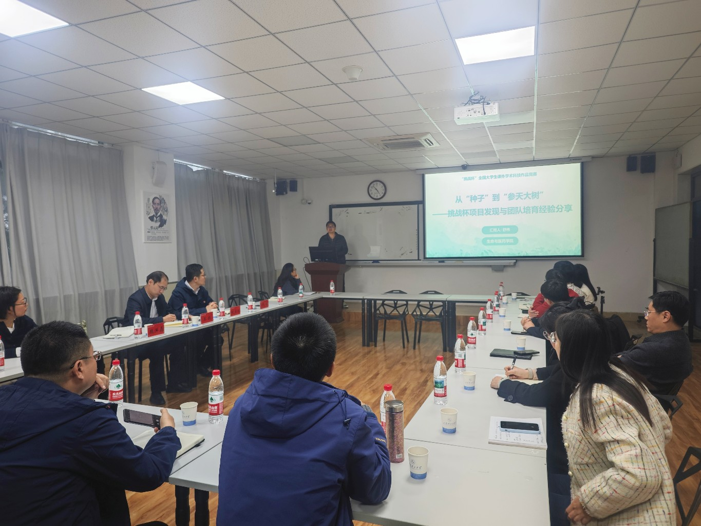 随后,生命与医药学院的舒伟老师以《从“种子”到“参天大树”——挑战杯项目发现与团队培育经验分享》为题,为在场师生带来了精彩的经验分享 。舒伟老师结合自身指导“挑战杯”国奖团队的经历,形象地将项目培育比作育树过程,提出了项目成功的“三根支柱”:选准赛道、组建战队、全程护航。在如何“选对好学生”方面,他分享了自己独到的“四有”潜力股模型,即寻找有内驱力、有执行力、有坚韧性及有团队精神的学生。舒老师强调,指导教师应扮演好“园丁”的角色,既要是战略规划师,也要是心理按摩师,坚持“授人以渔”,与学生建立相互信任、相互成就的“战友”关系。他通过复盘团队研发肉品腐败超前预警的项目历程,展示了如何从社会痛点中挖掘选题,并经过极致打磨最终斩获佳绩的过程。
