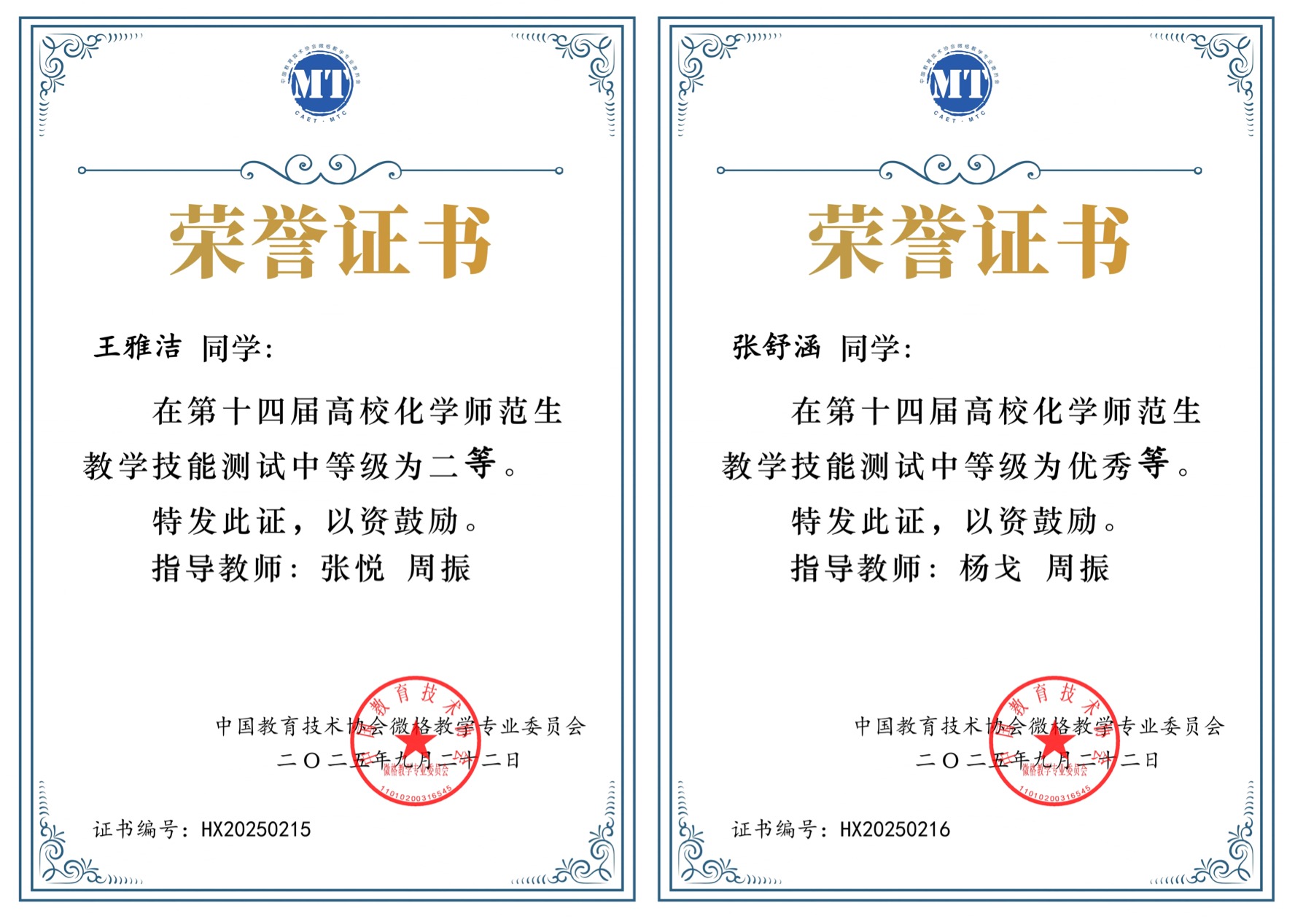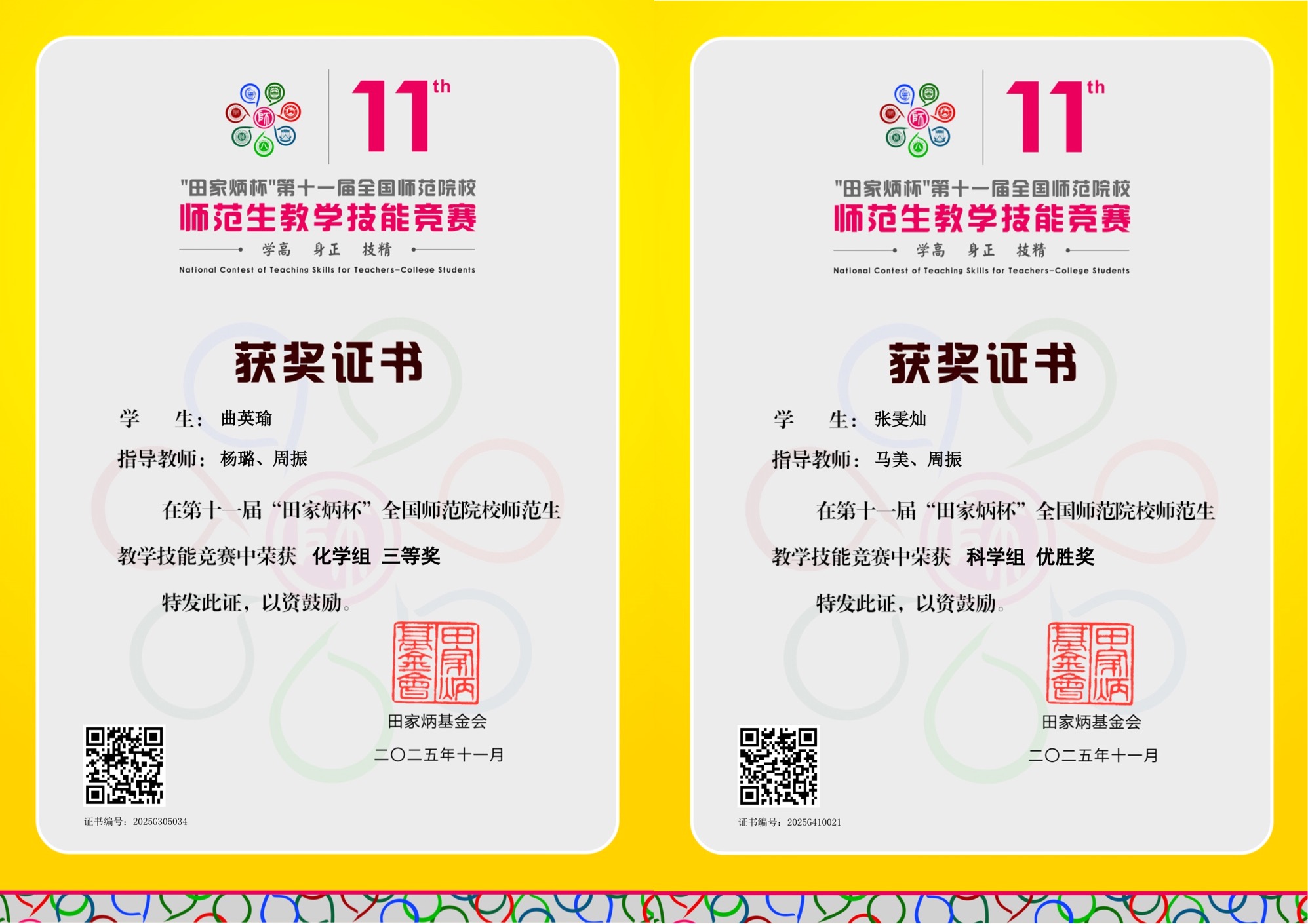 近日,第十一届“田家炳杯”全国师范院校师范生教学技能竞赛在浙江师范大学顺利闭幕,化学化工学院化学(师范类)专业化教2201班曲英瑜和化教2202班张雯灿在杨璐、马美、周振三位老师的指导下分获化学组三等奖和科学组优胜奖。这是我校学子首次参加该项赛事,这一成绩的取得实现了我校在国家级师范生竞赛中的新突破,也充分展示了我校师范生扎实的教学功底与良好的综合素养。