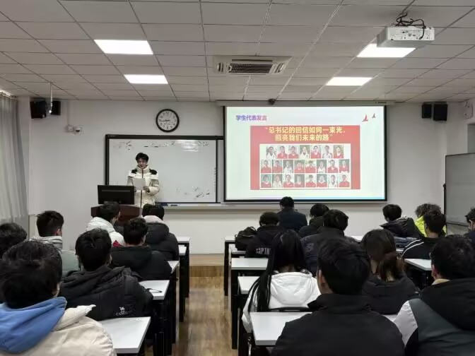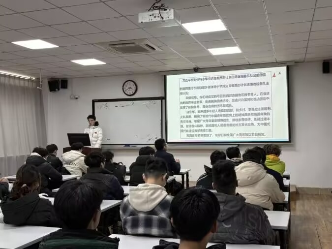 随后,翟洪栋同学带领大家学习了习近平总书记给新疆阿图什市哈拉峻乡谢依特小学戍边支教西部计划志愿者服务队队员的回信。总书记的殷切寄语温暖人心、催人奋进,在同学中引发热烈反响。学生代表赵文哲、郑博函结合专业与个人思考,分享了学习感悟。他们表示,总书记的回信为青年投身西部建设指明了方向,作为交通专业学子,应勇担使命,未来若有机会参加西部计划,必将发挥专业特长,以实际行动践行志愿精神。班会还组织全体同学齐声诵读志愿者誓词,在庄严的誓言中坚定奉献祖国的决心。
