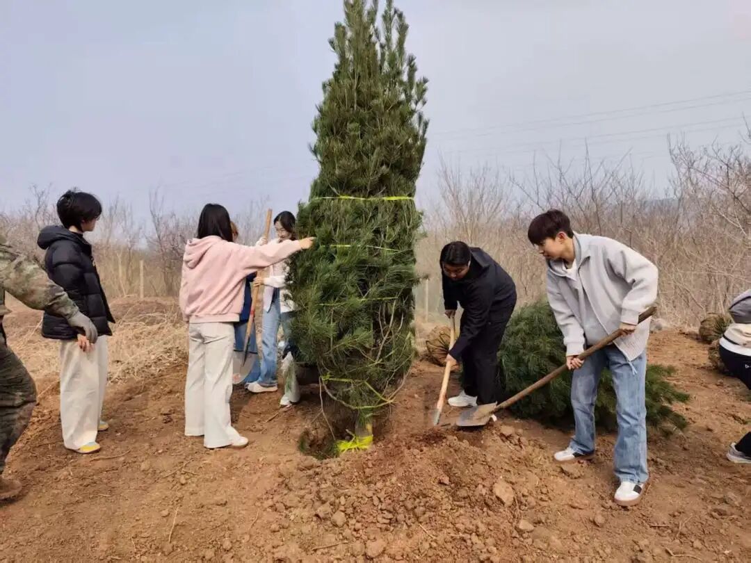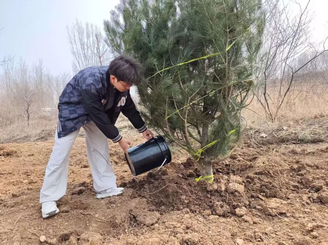 “植”此青绿,万物竞发。经过林场工作人员培训后,师生们每三人一组,配合默契,铲土、扶苗、培土、压实、浇水,每个步骤都扎实有序进行,确保树木能够茁壮成长,经过一个多小时的辛勤努力,数十株新栽下的树苗迎风挺立,在原山脚下“安家落户”,为原本略显荒芜的山坡增添了一抹新绿。